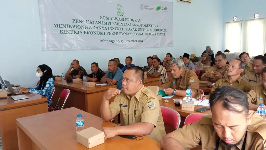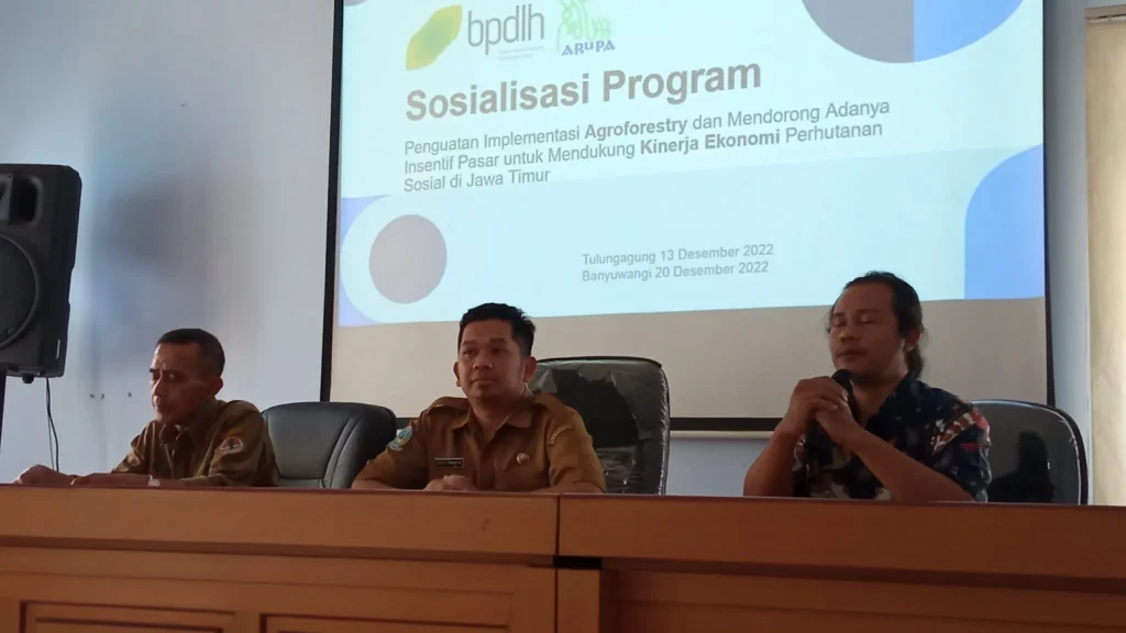 Jatim – Perkumpulan ARuPA (Aliansi Relawan untuk Penyelamatan Alam) bersama Cabang Dinas Kehutanan Wilayah Trenggalek berkomitmen dalam penguatan agroforestri. Hal tersebut terjalin melalui ‘Sosialisasi Program Penguatan Implementasi Agroforestri dan Mendorong Adanya Insentif Pasar untuk Mendukung Kinerja Ekonomi Perhutanan Sosial di Tulungagung’. Kepala Cabang Dinas Kehutanan (CDK) Wilayah Trenggalek, Agus D. Prasetyo menjelaskan sinergitas program dan kegiatan menjadi salah satu opsi dalam upaya merubah persepsi para penentu kebijakan di Pemerintah Kabupaten Tulungagung dan instansi terkait lainnya. “Konteks perhutanan sosial sebagai wadah kerja bersama untuk memberdayakan dan mensejahterakan masyarakat yang kebetulan lokusnya berada di dalam Kawasan Hutan,” ungkap Agus D. Prasetyo Selasa 13 Desember 2022. Agus mengaku, perhutanan sosial dapat berkontribusi untuk peningkatan kesejahteraan masyarakat, dan peningkatan lapangan usaha. Akhirnya berpotensi meningkatkan PAD Pemerintah Kabupaten Tulungagung. “Alhasil tercipta suatu simbiosis atau hubungan timbal balik yang saling memberi manfaat, baik bagi masyarakat, Pemerintah Daerah, serta kawasan hutan itu sendiri,” jelasnya. Ia berharap dapat menggali peran masing-masing OPD Pemerintah Kabupaten Tulungagung dan Cabang Dinas Kehutanan Wilayah Trenggalek. Yaitu dapat mendukung pelaksanaan perhutanan sosial melalui sinergitas program dan kegiatan pemberdayaan masyarakat.